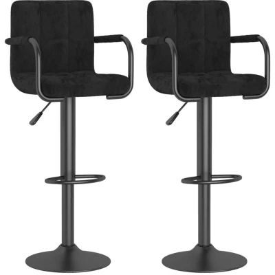 General description Enjoy a few sips of wine, grab a bite, or just relax while you sit on these stylish bar stools. Upholstered in soft-to-touch black velvet, these bar chairs provide optimal seating comfort. The sturdy powder-coated steel frame ensures durability, while the built-in footrest enhances your seating experience. With a gas lift mechanism, the counter stool can be adjusted in height, making it a perfect addition to any functional bar or dining area. Additionally, they can swivel 360 degrees for great flexibility. Technical specifications Colour: Black Material: Powder coated steel, velvet (100% polyester) Dimensions: 48 x 47 x (90-111) cm (W x D x H) Seat width: 40 cm Base diameter: 38.5 cm Maximum weight capacity: 110 kg per seat 360 degrees swiveling Gas lift mechanism With built-in footrest Adjustable in height: Yes Armrests: Yes Assembly required: Yes Delivery contains: 2 x Bar stool Other information