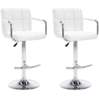 General description This elegant and modern bar stool set is designed to fit a variety of spaces, including home, office, bar, and cafe. The stools feature a comfortable seat and backrest upholstered in quality artificial leather, providing a pleasant seating experience. The strong chromed steel frame ensures durability and sturdiness. The practical gas lift mechanism allows for easy height adjustment, while the built-in footrest and armrest offer additional support and comfort. Technical specifications Colour: White Material: Artificial leather (60% PU, 30% polyester, 10% cotton), steel Dimensions: 46 x 49 x (93 - 113) cm (W x D x H) Base diameter: 38.5 cm Max. loading capacity: 110 kg Height adjustable: Yes Assembly required: Yes Other information