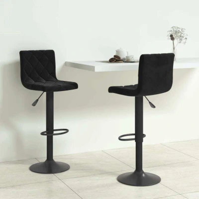 General description Enjoy a glass of wine, grab a bite, or just relax while you sit on these stylish bar stools. Upholstered in soft-to-touch black velvet, these bar chairs provide optimum seating comfort. The chromed steel frame ensures high sturdiness and stability, while the built-in footrest enhances your seating experience. With a gas lift mechanism, these swivel bar stools can be adjusted in height, making them a perfect addition to any functional bar or dining area. They also swivel 360 degrees for great flexibility. Technical specifications Colour: Black Material: Velvet (100% polyester), powder-coated steel Filling material: Foam Dimensions: 40 x 43 x (90-111) cm (W x D x H) Backrest height: 35.5 cm Base diameter: 38.5 cm Maximum weight capacity: 110 kg per seat Assembly required: Yes Other information