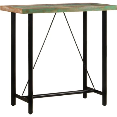 ManoManoGeneral description Enjoy a delightful meal or sip your favorite wine with family and friends around this stylish bar table. Crafted from solid reclaimed wood and featuring a sturdy iron frame, this table combines durability with a rustic charm. Technical specifications Material: Solid reclaimed wood with a mixed color finish, iron Dimensions: 110 x 55 x 107 cm (W x D x H) Assembly required: Yes Other information