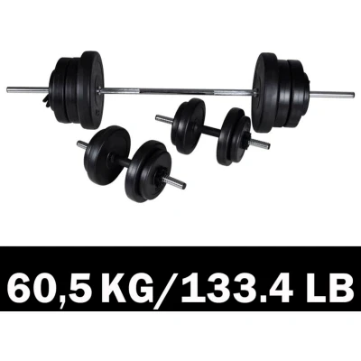 General description This ergonomically designed barbell and dumbbell set allows you to work out comfortably at home. It is suitable for users ranging from beginners to professionals, meeting various exercise intensity needs with its detachable design. Technical specifications Barbell bar: Ø2.5 cm, length 140 cm, weight 2 kg Dumbbell bar: Ø2.5 cm, length 45 cm, weight 0.5 kg Grip size: approx. 14.5 cm (barbell), 10 cm (dumbbell) Weight discs: Polyethylene casting Weight discs dimensions: 1.25 kg: Ø 17.5 cm, 3 cm thick 2.5 kg: Ø 22 cm, 4 cm thick 5 kg: Ø 27 cm, 4.5 cm thick 10 kg: Ø 32 cm, 5.5 cm thick Total weight including bars: 60.5 kg Total weight of discs: 57.5 kg Bar maximum load capacity (140 cm): 120 kg Usage This multifunctional barbell set is ideal for training various muscle groups, including the chest, biceps, arms, triceps, and back muscles. Other information