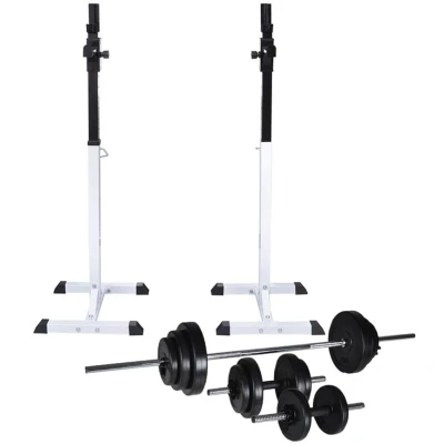 VidaXLThis heavy-duty barbell/squat rack with a barbell and dumbbell set is ideal for squat and bench press training in your home gym. Stable barbell rack: This stable barbell rack is suitable for barbell bars with a diameter of approximately 45-50 mm. It has a rugged steel construction and a maximum load capacity of 80 kg.Adjustable height: The rack is adjustable in height and suitable for almost any body size and various exercises. Moreover, it is compact and space saving. Robust barbell and dumbbell set: The barbell and dumbbell set features solid chrome-plated bars with quick-action spring collars (for barbell bar), non-slip knurled grips, and fluted star-screw caps (for dumbbell bars) for secure attachment of the weight plates. You can work out without worrying about safety issues. The weight plates are made with a robust polyethylene casing.