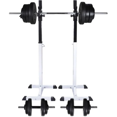 ManoManoGeneral description This robust and stable barbell/squat rack with a barbell and dumbbell set is perfect for your home gym! In combination with a workout bench, it is suitable for bench press training as well as squats. The rack is adjustable in height, making it suitable for almost any body size and various exercises. It features a rugged steel construction and a maximum load capacity of 80 kg, while being compact and space-saving. Technical specifications Barbell/squat rack dimensions: 50 x 48 x (107-165) cm (L x W x H) 12 adjustable settings: Minimum height 107 cm, maximum height 165 cm Maximum bearing weight of the bar: 80 kg Main tube size: 50 x 50 mm (L x W) Net weight of the rack: 15.5 kg Total weight including bars: 60.5 kg Total weight of plates: 57.5 kg Bar maximum load capacity (140 cm): 120 kg Compatibility and accessories Suitable for barbell bars with a diameter of approximately 45-50 mm Includes: barbell/squat rack, barbell bar, two dumbbell bars, six 1.25 kg weight