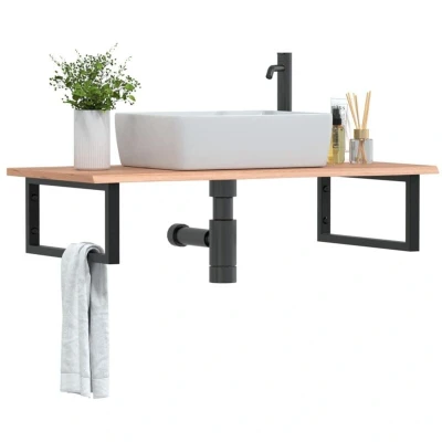 ManoManoGeneral description The wall mounted basin shelf securely attaches to the wall, providing an elegant and space-saving solution for your bathroom. This basin shelf features a sturdy steel structure combined with a solid oak wood top, ensuring stability and longevity. The floating design offers ample space for storing creams and small items, while the rectangular shape allows for hanging towels or other items, maximizing your bathroom space. Technical specifications Countertop: Colour: Light brown Material: Solid oak wood with a varnish finish Dimensions: 100 x 50 x 2 cm (L x W x T) Shelf bracket: Colour: Black Material: Steel Shelf bracket size: 20 x 45 cm (W x L) Tube size: 3 x 3 cm (W x L) Shape: Rectangular Loading capacity: 100 kg Wall mounting holes distance: 60 mm Tabletop hole distance to the edge: 60 mm on each side With 2 holes for wall mounting and 2 holes for tabletop mounting Assembly required: Yes Delivery contains: 1 x Countertop 2 x Shelf bracket Compatibility and