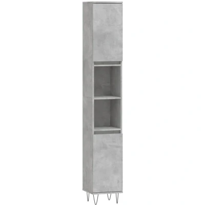 ManoManoGeneral description This bathroom cabinet is a stylish and practical addition to your bathroom, providing a tidy and striking appearance. It is designed to offer ample storage while enhancing the overall aesthetic of your space. Technical specifications Colour: Concrete grey Material: Engineered wood, iron Dimensions: 30 x 30 x 190 cm (W x D x H) Feet height: 10 cm Assembly required: Yes Installation Flexible door installation: Doors can be installed on either the left or right side based on your preference. Warning: To prevent the cabinet from being overturned, it must be secured using the provided wall attachment device. Note: Screws and plugs for wall attachment are not included; it is recommended to use screws and plugs suitable for your specific wall type. Usage Ample storage space: The cabinet features 4 compartments with doors and 2 open shelves, providing various storage options for your bathroom items. Durable material: The engineered wood offers strength, stability, and