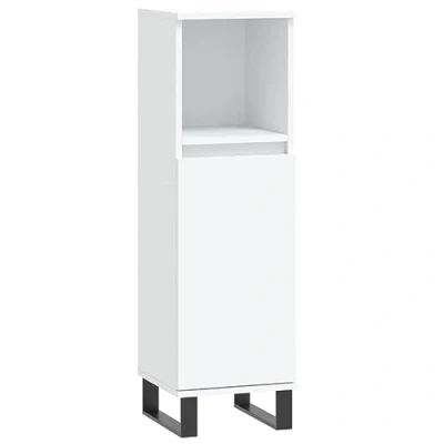 General description This bathroom cabinet is a great addition to your bathroom, providing a tidy and striking appearance. It features durable engineered wood with a smooth surface, ensuring strength, stability, and resistance to moisture. Technical specifications Colour: White Material: Engineered wood, iron Overall dimensions: 30 x 30 x 100 cm (W x D x H) Feet height: 10 cm Assembly required: Yes Compatibility and accessories Flexible door installation: The door can be installed on either the left or right side based on your needs. Iron feet: Adds an industrial style while ensuring stability. Installation To prevent the cabinet from being overturned, it must be used with the provided wall attachment device. Usage Ample storage space: The cabinet includes 2 compartments with doors and 1 open shelf, offering various storage options for your bathroom items. Other information