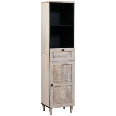 ManoManoGeneral description This rectangular Bathroom Cabinet combines rustic charm with modern flair, creating a serene atmosphere in your bathroom. Made from solid Mango wood, it features a beautiful natural grain and warm tones, enhancing the overall aesthetic. The wall-mounted design optimizes floor space while maintaining a tidy appearance. Technical specifications Colour: White Material: Solid Mango wood Overall dimensions: 33.5 x 38 x 160 cm (W x L x H) Frame material: Solid mango wood With 1 flush door Indoor use only Assembly required: Yes EAN: 8721158452313 SKU: 4018138 Usage Sturdy storage options with multiple drawers and compartments for organizing towels, toiletries, and other bathroom essentials. Easy maintenance with simple care instructions—just wipe with a dry cloth to keep it looking sharp. Other information
