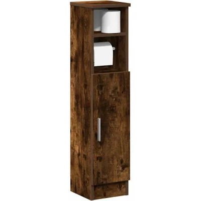 ManoManoGeneral description The bathroom cabinet is an ideal choice for your space, combining both style and functionality, offering ample storage to keep your toiletries and essentials neatly organized. It features a built-in paper roll holder for added convenience, ensuring toilet paper is always within easy reach. Technical specifications Colour: Smoked oak Material: Engineered wood Dimensions: 20.5 x 22 x 90 cm (W x D x H) Total weight capacity: 60 kg Weight capacity per shelf: 20 kg With a toilet paper roll holder Assembly required: Yes Installation You can assemble the door either to the left or right side of the cabinet opening, according to your personal preferences or space requirements. To prevent tipping, this product must be used with the provided wall attachment device. Usage This bath cabinet offers versatile storage options with an open shelf for easy access to frequently used items, and a closed cabinet for storing larger items like towels and cleaning supplies. Its smooth