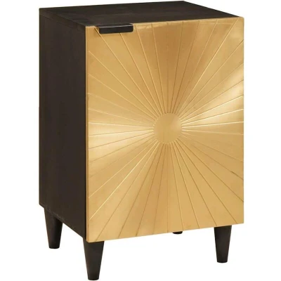This Modern Bathroom Cabinet offers a sleek and simple solution for your storage needs. Crafted to fit seamlessly into contemporary home settings, it presents clean lines and a minimalist style while efficiently utilizing bathroom space. The striking contrast of black and gold tones adds an elegant touch, making it a visually appealing piece that can elevate any bathroom décor. This cabinet is ideal for individuals aiming to optimize their storage without sacrificing style, all while maintaining a neat and organized space. Premium Materials: This cabinet is crafted from solid mango wood, known for its robustness and attractive grain patterns. The choice of this wood not only ensures enduring quality but also offers a warm and natural look that complements the glossy finish of the cabinet. The engineered wood components add lightweight support, making for an overall sturdy but easy-to-handle piece. Components and Design: Featuring edge pulls, the cabinet doors provide a clean, uncluttered front with easy access to stored items. The interior includes board shelves that are straightforward yet efficient in storing various bathroom essentials. The hinge doors enhance functionality, allowing them to open smoothly and fully. Functional Features: The cabinet is designed to be a practical storage space, integrating multiple shelves and compartments that cater to diverse storage needs. Its modern aesthetic is achieved with a combination of gold colored door fronts and black legs, which offer a stylish yet functional design. Versatile Usage: Perfectly suited for modern bathrooms, this cabinet is designed to keep your space tidy and organized. It provides ample room to store toiletries, towels, and more, contributing to a clutter-free environment. Care and Maintenance: Maintain the cabinet's appearance by wiping it down with a damp cloth. Avoid using harsh chemicals to preserve the finish and longevity of the materials. Its easy-care requirements facilitate hassle-free upkeep.