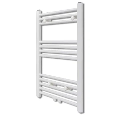General description This towel radiator serves a dual purpose as both a towel warmer and a space heater, helping to keep bathrooms warm and mold-free while efficiently drying large towels and long bathrobes. Utilizing a hot water circulation system, it dries towels quickly without incurring electric bills. Technical specifications Dimensions: 500 x 764 mm (W x H) Heat output: 315 W (248.2 BTU) Material: Steel Colour: White Style: Straight Distance between pipe centres: 450 mm Distance between the wall and the front of the radiator: 80 mm Number of cross-bars: 12 with a diameter of 22 mm, divided into 3 sections of 3, 4, 5 Wall mounting: Yes Fixing pack: Included Note: The towel radiator is water heating, not electric. Installation Easy to assemble Includes wall brackets and screws for installation Usage Ideal for drying towels and bathrobes Helps maintain a warm and mold-free bathroom environment Other information Children should be supervised to ensure that they do not play with the