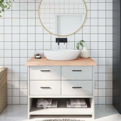 Are you planning to renovate your countertops at home? This wooden bathroom countertop is a perfect choice! Durable construction: This bathroom worktop is made of solid oak wood, which is a beautiful natural material. Oak wood has a medium brown colour and a dense grain, contributing to its unique look.Versatile applications: Besides a bathroom vanity top, this wooden countertop can be combined with different bases according to your needs. It can be used as a shelf, cabinet top, desk top, table top etc.Untreated surface: As the bathroom top is crafted from solid oak wood with no finish, you can keep its natural colour but also can paint or lacquer it as per your preference.Handmade with live edge: This bathroom vanity countertop is handmade with a live edge. Due to that the knots, cracks, slightly curved shapes, and colour tones are part of the oak wood, every piece of oak countertop has its own unique character to display. The delivery is random. Good to know:As a natural product, wood may show knots and imperfections that we fill with black fillings to ensure a smooth appearance.