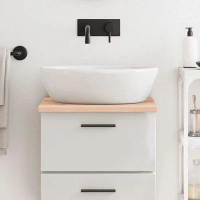 ManoManoGeneral description This wooden bathroom countertop is an excellent choice for those looking to renovate their spaces. Made from solid oak wood, it features a beautiful natural medium brown color and a dense grain, making each piece unique. The countertop is versatile and can be used not only as a bathroom vanity top but also as a shelf, cabinet top, desk top, or table top. Technical specifications Material: Solid oak wood (untreated) Dimensions: 40 x 50 x 2 cm (L x W x T) Max. load capacity: 20 kg Features live edge SKU: 3155999 Other information As a natural product, wood may show knots and imperfections that are filled with black fillings for a smooth appearance.