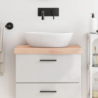 ManoManoGeneral description This wooden bathroom countertop is a perfect choice for those planning to renovate their countertops at home. Made from solid oak wood, it features a beautiful natural medium brown color and a dense grain, contributing to its unique look. The countertop is versatile and can be used not only as a bathroom vanity top but also as a shelf, cabinet top, desk top, or table top. Its untreated surface allows you to maintain its natural color or customize it with paint or lacquer according to your preference. Each piece is handmade with a live edge, showcasing the natural knots, cracks, and color tones of the oak wood, making every countertop unique. Technical specifications Material: Solid oak wood (untreated) Overall dimensions: 60 x 30 x (2-6) cm (L x W x T) Max. load capacity: 20 kg Features live edge SKU: 3156007 Other information As a natural product, wood may show knots and imperfections that are filled with black fillings to ensure a smooth appearance.