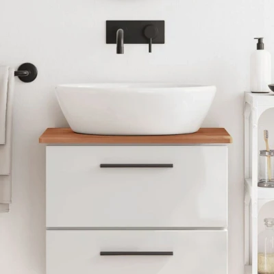 ManoManoGeneral description This wooden bathroom countertop is a perfect choice for those planning to renovate their countertops at home. Made from solid beech wood, it features a beautiful natural finish and is designed for durability and versatility. Technical specifications Material: Solid beech wood with a lacquer finish Dimensions: 60 x 40 x 1.5 cm (L x W x T) Each item is unique with variations in colors and grains Installation This countertop can be used as a bathroom vanity top, a shelf, or a cabinet top. It can be combined with any styled legs to suit your needs. Usage The smooth surface is easy to clean with a damp cloth. The rounded corners help reduce the risk of collisions, enhancing safety for children and family. Other information