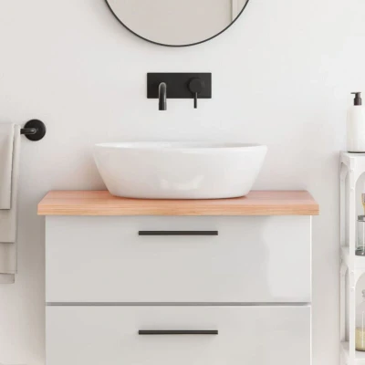 ManoManoGeneral description This wooden bathroom countertop is an excellent choice for those looking to renovate their spaces. Made from solid oak wood, it features a beautiful light brown color and a unique grain pattern, making each piece distinct. The countertop is versatile and can be used not only as a bathroom vanity top but also as a shelf, cabinet top, desk top, or table top. Technical specifications Material: Solid oak wood with a varnish finish Overall dimensions: 80 x 60 x (2-4) cm (L x W x T) Max. load capacity: 38.4 kg Features live edge Other information As a natural product, wood may show knots and imperfections that are filled with black fillings for a smooth appearance. Images: