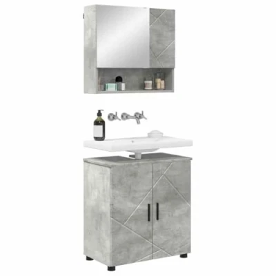 ManoManoGeneral description The Modern Bathroom Furniture Set is the ideal mix of function and style for today’s living spaces. With its sleek finish and smooth surfaces, it fits right in with any modern bathroom or hallway. Perfect for fans of minimalist vibes, this furniture set brings together practicality and elegance, offering handy storage solutions without taking up much space. The design makes everything easy to use, turning your daily routines into a breeze. Technical specifications Colour: Concrete grey Material: Engineered wood Overall dimensions: 61 x 35 x 64 cm (L x W x H) Weight: 28.35 kg Frame material: Engineered wood Number of doors: 3 Indoor / outdoor: Indoor only Number of items: 2 Assembly required: Yes EAN: 8721288869135 SKU: 3392936 Brand: vidaXL Compatibility and accessories Includes: 1 x Bathroom sink cabinet 1 x Bathroom mirror cabinet Installation Wall-mounted design for space-saving Easy to mount, providing a functional setup Usage Ideal for storing grooming