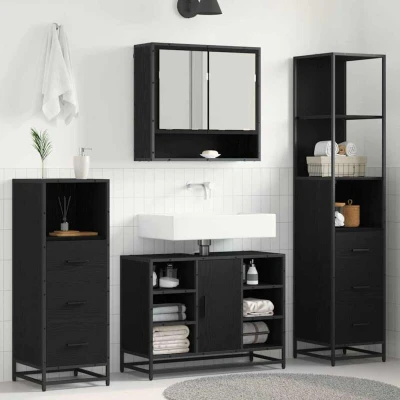 ManoManoGeneral description The Bathroom Furniture Set is a practical and stylish addition to any modern bathroom, featuring a sleek design that enhances contemporary spaces. Crafted from durable engineered wood, this set offers ample storage solutions while maintaining a sophisticated appearance with its smooth matte finish and eye-catching texture. Technical specifications Colour: Black oak Material: Engineered wood and steel Overall dimensions: 35 x 37.5 x 166 cm (L x W x H) Weight: 67.37 kg Frame material: Steel Indoor / outdoor: Indoor only Number of items: 3 Assembly required: Yes Compatibility and accessories Includes: 1 x Mirror cabinet 1 x Sink cabinet 1 x Bathroom cabinet With drawer With plane mirror With shelf With 3 doors Installation Mounting included: Wall / ceiling fixtures (specific screws or wall plugs not included) Usage Easy maintenance: Simply wipe with a damp cloth to keep surfaces pristine. High resilience against stains and damage ensures the furniture remains