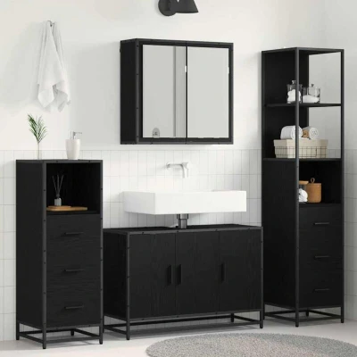 ManoManoGeneral description This stylish bathroom furniture set combines form and function, making it a perfect fit for modern bathrooms. Its sleek lines and minimalist vibe create a cool balance, great for anyone wanting a clean and organized space to freshen up. The set’s flexible design fits various bathroom sizes and styles, adding a bit of sophistication and practicality to any home. Technical specifications Colour: Black oak Material: Engineered wood Overall dimensions: 90 x 33 x 60 cm (L x W x H) Weight: 67.34 kg Frame material: Metal Number of items: 3 Assembly required: Yes EAN: 8721359480955 SKU: 3402455 Compatibility and accessories Includes: 1 x Mirror cabinet 1 x Sink cabinet 1 x Bathroom cabinet With drawer With plane mirror With 5 doors Installation Assembly is required for this furniture set. Usage This bathroom furniture set is designed for indoor use only, providing a stylish and functional solution for your bathroom storage needs. Other information