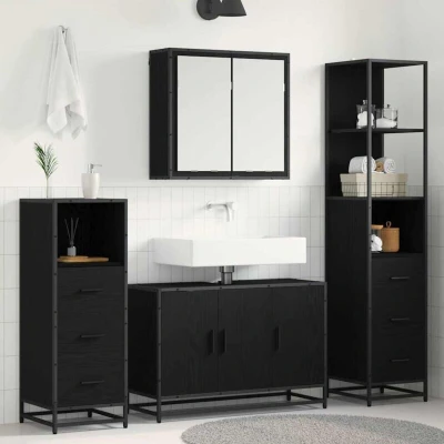 ManoManoGeneral description This Wooden Bathroom Furniture Set exemplifies modern style, featuring clean lines and minimal ornamentation. Comprised of engineered wood and metal, it can transform any bathroom into a functional and stylish space. Designed to fit contemporary tastes, this set is ideal for those who appreciate both form and function, bringing a chic and sophisticated atmosphere to your bathroom. Its classic rectangular shape provides versatility, suiting diverse decor choices, and offers ample space-saving storage for organizing your essentials. Technical specifications Colour: Black oak Material: Engineered wood Overall dimensions: 90 x 33 x 60 cm (L x W x H) Weight: 89.2 kg Frame material: Metal Number of items: 4 With 5 doors With drawer With plane mirror Indoor only Assembly required: Yes EAN: 8721359481242 SKU: 3402484 Compatibility and accessories Includes: 1 x Mirror cabinet 1 x Sink cabinet 1 x Bathroom cabinet (low) 1 x Bathroom cabinet (high) Installation Assembly