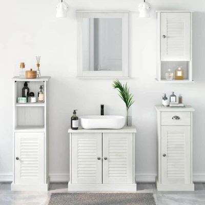 This Bathroom Furniture Set provides a tasteful blend of modern aesthetics and practical functionality. Crafted from solid pine wood, its rectangular design fits seamlessly in various bathroom settings. Characterized by simplistic lines and minimal ornamentation, the set adds a sense of tranquility and elegance to your space. Whether you use it for storage or as a feature piece, its stylish appearance and robust build make it a worthy addition to any bathroom, enhancing both visual appeal and utility. Solid Pine Wood Construction This furniture set is crafted from premium solid pine wood, renowned for its durability and classic appearance. The robust structure ensures the set withstands daily usage while maintaining its aesthetic appeal. The material's natural patterns and warm tones create a soothing and welcoming atmosphere, well-suited for modern interiors seeking a touch of nature. Contemporary Design The clean lines and minimalist design reflect modern sensibilities, making the set ideal for contemporary bathroom decor. Its understated elegance fits seamlessly into various styles, providing a chic and organized look. The set's simplicity doesn’t compromise on style, making it a focal point in any room. Secure Solid Wood Doors Featuring solid wood doors, the set ensures secure storage for your bathroom essentials. The robust doors blend functionality with style, keeping contents safe and accessible while enhancing the unit's overall visual appeal. The natural charm and strength of the wood lend a sophisticated touch to the design. Practical Usage Designed for indoor bathroom spaces, the furniture set offers ample storage, enabling efficient organization of toiletries and linens. Its practical design supports decluttering, making it ideal for maintaining a tidy and accessible bathroom environment. Easy Maintenance This set's maintenance involves simple cleaning methods; a quick wipe with a dry cloth keeps it looking pristine. This low-maintenance requirement ensures that the set remains a reliable and appealing fixture for years, contributing to an easy upkeep lifestyle.