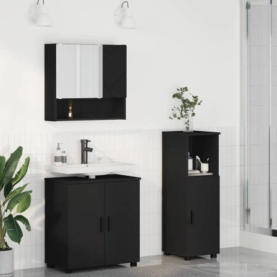 ManoManoGeneral description Check out this Modern Bathroom Furniture Set—a classy and efficient storage solution that's just right for modern spaces. With its sleek lines and sharp shapes, it mixes style with practicality. You can even wall-mount it to keep your floors clear, perfect for smaller bathrooms. The built-in mirrors ensure you get a nice blend of looking good and being functional when you're getting ready. Technical specifications Colour: Black Material: Engineered wood Overall dimensions: 61 x 35 x 64 cm (L x W x H) Weight: 40.71 kg Frame material: Engineered wood Number of items: 3 Assembly required: Yes EAN: 8721288869210 SKU: 3392944 Compatibility and accessories Includes: 1 x Bathroom sink cabinet 1 x Bathroom mirror cabinet 1 x Bathroom cabinet Usage This set is great for personal grooming and storage, featuring a mirror cabinet that fits perfectly into your daily routine. Its user-friendly setup makes it easy to keep organized and enjoy a bit of pampering at home. Other