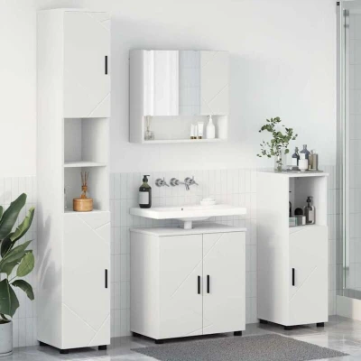 ManoManoGeneral description The Modern Bathroom Furniture Set is designed to seamlessly fit into contemporary spaces. Featuring a wall-mounted mirror cabinet and multiple bathroom cabinets, it combines style and functionality to meet your bathroom needs. Its rectangular shape and clean lines create an illusion of a larger area while providing ample storage for all your bathroom essentials. Technical specifications Colour: White Material: Engineered wood Overall dimensions: 61 x 35 x 64 cm (L x W x H) Weight: 66.05 kg Number of items: 4 With 7 doors Indoor use only Assembly required: Yes EAN: 8721288869401 SKU: 3392963 Included Components Bathroom sink cabinet Wall-mounted mirror cabinet Two additional bathroom cabinets Features / Function / Design Wall-mounted design saves space and adds a classy vibe Mirrors provide a clear reflection for grooming Sleek handles and flush doors enhance the modern aesthetic Care & Maintenance Wipe down with a damp cloth to remove dirt or moisture Regular care