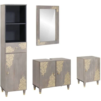 ManoManoGeneral description This Bathroom Furniture Set adds a bit of rustic charm to your space. Built to look good and work hard, its warm hues and sturdy build make it a striking feature in your bathroom. With its distinctive rustic style, this set suits both traditional and modern bathrooms, creating a calm feel that’s just right for unwinding. Technical specifications Colour: Grey Material: Solid rough mango wood Overall dimensions: 62 x 33 x 58 cm (L x W x H) Frame material: Solid mango wood Number of items: 4 Assembly required: Yes EAN: 8721158415547 SKU: 3310155 Compatibility and accessories Includes: 1 x Sink cabinet 1 x Mirror cabinet 1 x Bathroom cabinet (L) 1 x Bathroom cabinet (S) Installation Setting it up requires two people and a screwdriver, but it’s straightforward. Usage Keeping this furniture set looking good is super easy—just a quick wipe with a dry cloth does the trick. Other information