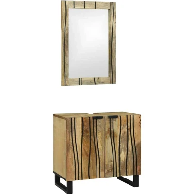 ManoManoGeneral description The Modern Bathroom Furniture Set is a classy option for sprucing up any bathroom. It has a simple, sophisticated vibe with clean lines and minimal fuss, typical of modern design. The set includes essential furniture pieces that look good while helping you keep everything tidy. Technical specifications Colour: Brown Material: Solid rough mango wood Overall dimensions: 62 x 33 x 58 cm (L x W x H) Weight: 18.45 kg Storage: 2 shelves, 2 doors Includes silvered mirror Indoor use only Assembly required: Yes EAN: 8721158408211 SKU: 3310042 Brand: vidaXL Usage Easy to maintain; simply wipe with a damp cloth to keep it looking fresh. Ideal for busy lives, ensuring it remains functional and attractive for ages. Other information
