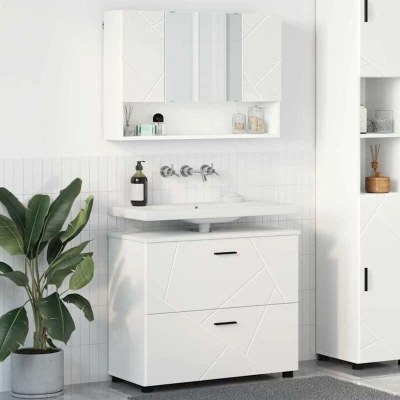General description The Engineered Wood Bathroom Furniture Set perfectly mixes modern style and practical design. With its clean lines and smooth look, this set enhances your bathroom's vibe while providing solid storage solutions. It's ideal for anyone who loves simplicity and smart space use, combining sleek aesthetics with a sturdy engineered wood structure, perfect for contemporary styles. The set's chic and minimal vibe brings a calming feel to the bathroom, improving the overall atmosphere. Key features include mirrored cabinets and spacious shelves, making it perfect for storing toiletries, towels, and other essentials. Technical specifications Colour: White Material: Engineered wood Overall dimensions: 76.5 x 35 x 64 cm (L x W x H) Weight: 38.45 kg Included components: 1 x Bathroom sink cabinet, 1 x Bathroom mirror cabinet Number of items: 2 Assembly required: Yes Frame material: Engineered wood With drawer With plane mirror With 6 shelves With 3 doors Indoor use only EAN: