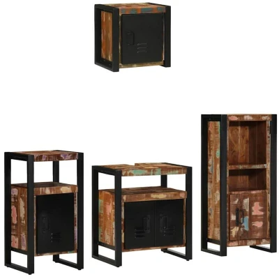 ManoManoGeneral description This Industrial Bathroom Cabinet Set features a sleek and modern industrial style, perfect for contemporary homes. It adds a touch of urban loft charm to your bathroom while providing practical storage solutions. Ideal for those looking to organize their space without sacrificing aesthetics, this set is designed to blend seamlessly with your decor, making it a great choice for smaller areas. Technical specifications Colour: Multicolour Material: Solid reclaimed wood Overall dimensions: 55 x 35 x 60 cm (L x W x H) Weight: 61.55 kg Number of items: 4 Assembly required: Yes EAN: 8721158305312 SKU: 3305639 Compatibility and accessories Includes: 1 x Bathroom cabinet: 55 x 35 x 60 cm (L x W x H) 1 x Bathroom cabinet: 40 x 35 x 75 cm (L x W x H) 1 x Wall-mounted bathroom cabinet: 40 x 30 x 90 cm (L x W x H) 1 x Wall-mounted bathroom cabinet: 40 x 30 x 40 cm (L x W x H) Installation Wall-mounted design for easy installation and space-saving. Assembly required for all
