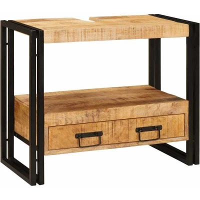 ManoManoGeneral description This vanity cabinet fits right into any modern bathroom, blending style and practicality. With its simple design and rectangular shape, it’s perfect for anyone wanting to enhance their space with smart elegance. It’s ideal for neatly storing toiletries while keeping things clutter-free, suiting minimalists and organization lovers alike. Technical specifications Material: Solid mango wood and iron Overall dimensions: 71 x 33 x 58 cm (L x W x H) Weight: 12.09 kg Frame material: Iron Indoor / outdoor: Indoor only Assembly required: Yes EAN: 8721158602114 SKU: 4102769 Smart Storage Solutions The cabinet features clever storage options like drawers and shelves, ensuring bathroom essentials are easy to reach while remaining neatly tucked away. This layout effectively hides personal items while maintaining a clean look. Sturdy Construction Built to last, this vanity cabinet is designed for daily use, making it a dependable addition to any bathroom. Its strong build