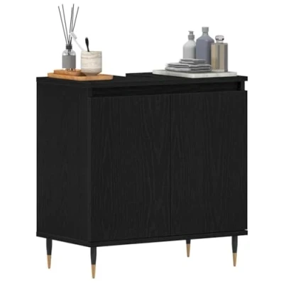 ManoManoGeneral description This bathroom sink cabinet is all about style and practicality, making it a top choice for modern bathrooms. With its sleek black oak finish and contemporary design, it not only offers great usefulness but also enhances your space. Technical specifications Dimensions: 58 x 33 x 60 cm (L x W x H) Leg Height: 15 cm Material: Engineered wood Colour: Black Finish: Matte Number of Doors: 2 Assembly Required: Yes Recommended Number of People for Assembly: 1 Usage Practical Storage: With two roomy compartments behind hinged doors, you can keep your items organized and close at hand, creating a clutter-free space. Contemporary Style: This cabinet features a modern design with a neat shape and tapered legs, making it a stylish addition to any contemporary setting. Other information