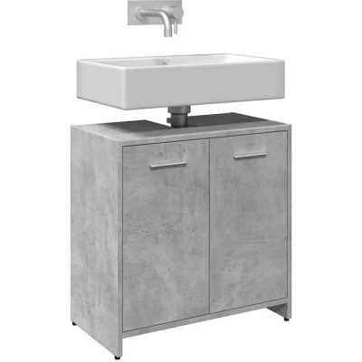 ManoManoGeneral description This bathroom sink cabinet offers a stylish and practical solution for creating additional storage space in your bathroom. Its clean lines and sleek design ensure it blends seamlessly into your decor while providing ample storage for toiletries, laundry essentials, and more. Technical specifications Colour: Concrete grey Material: Engineered wood Dimensions: 60 x 33 x 60 cm (W x D x H) Assembly required: Yes Usage Easy to clean with a damp cloth due to its smooth surface. Practical handles for comfortable grip and easy access. Other information Warning: To prevent tipping, use the provided wall attachment device.
