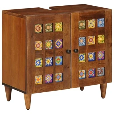 VidaXLThis is a meticulously crafted Bathroom Sink Cabinet designed to amplify the aesthetics and functionality of modern homes. Perfectly suited to fit in a host of bathroom spaces, this elegant piece embodies simplicity, modern style, and practicality. Visually appealing with its combination of solid mango wood and metal, it emanates a polished yet warm vibe, seamlessly enhancing any bathroom decor. Imagine a clutter-free space where every essential is easily accessible, adding a touch of sophistication to daily routines. Solid Mango Wood: This cabinet is crafted from solid mango wood, known for its durability and robust nature. The wood's natural grain provides a unique character, adding warmth and elegance to your bathroom. This selection ensures reliability and a high-end look, making it suitable for long-term use. Metal Legs: The cabinet stands firmly supported by robust metal legs, painted in a refined black finish. These legs offer sufficient stability and a contemporary touch, enhancing the bathroom's aesthetic. Their sturdy nature ensures that the cabinet holds up well over time, underscoring its practicality and stylish design. Spacious Interior: Featuring a well-thought-out design, this cabinet is equipped with ample storage space behind its doors. This configuration provides a clutter-free environment, allowing easy access to necessities while maintaining a clean and organized ambiance. It is designed to accommodate a variety of items, promoting efficient space utilization. Modern Aesthetic: Embrace a minimalistic yet chic look with this cabinet’s sleek lines and understated design. Tailor-made for those who appreciate simplicity combined with functionality, it adds charm to any modern or contemporary setting, lifting the overall appearance of the bathroom. Care and Maintenance: Keeping the cabinet in pristine condition is straightforward and requires minimal effort. Simply wipe it with a damp cloth to maintain its surface clean and fresh, ensuring longevity and a spotless appearance. This ease of maintenance is appreciated by those looking for a worry-free solution.