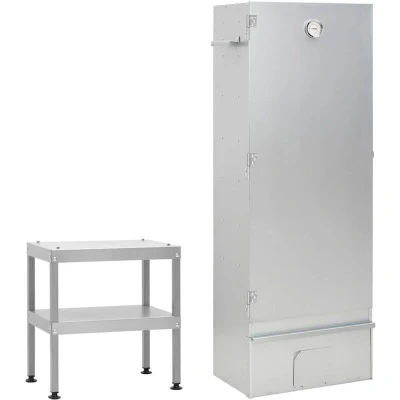 ManoManoGeneral description Use this multifunctional BBQ oven smoker with table to create a feast and enjoy cozy outdoor moments with your family! Made from durable galvanised steel, this smoker offers sturdiness and stability, making it perfect for outdoor use. Technical specifications Oven smoker dimensions: 44.5 x 29 x 110 cm (W x D x H) Table dimensions: 40 x 28 x 44.5 cm (L x W x H) Material: Galvanised steel Zinc-plated fire bowl, rack, and ash box Drawer with handle Assembly required: Yes Storage and accessories Includes 12 S-shaped hooks Includes 3 grids Includes 1 kg wood chips Table features 2 open shelves for organized storage of BBQ supplies Usage The smoker oven is equipped with a thermometer to monitor the chamber temperature, ensuring optimal grilling conditions. It is designed for outdoor use only; do not use in confined or habitable spaces to avoid the risk of carbon monoxide poisoning. Other information WARNING! This barbecue becomes very hot. Do not move it during