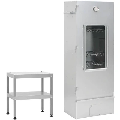 ManoManoGeneral description Use this multifunctional BBQ oven smoker with table to create a feast and enjoy cozy outdoor moments with your family! Made from durable galvanized steel, this smoker offers sturdiness and stability, making it perfect for outdoor use. Technical specifications Oven smoker material: Galvanised steel, glass Oven smoker dimensions: 44.5 x 29 x 110 cm (W x D x H) Glass window size: 19.5 x 41.5 cm (L x W) Table material: Galvanised steel Table dimensions: 40 x 28 x 44.5 cm (L x W x H) Assembly required: Yes Included accessories: 12 x S-shaped hook, 3 x Grid, 1 kg wood chip Storage and features Ample smoker space for meat, fish, sausages, and more. Equipped with a thermometer to monitor chamber temperature. Glass window allows you to check on food without opening the smoker. Adjustable screw for stabilizing the worktable on uneven ground. Two open shelves for organizing BBQ supplies within easy reach. Sturdy tabletop supports the oven smoker effectively. Usage Warning: Do