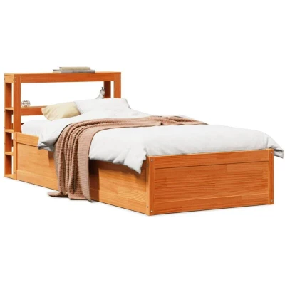 General description Get a better restful night's sleep with this stylish bed frame! It makes a welcoming addition to any bedroom, combining functionality with rustic charm. Technical specifications Colour: Wax brown Material: Solid pinewood Slat material: Plywood Overall dimensions: 215.5 x 96.5 x 82 cm (L x W x H) Suitable mattress size: 90 x 190 cm Single (mattress not included) With storage shelves Assembly required: Yes Compatibility and accessories A mattress is not included with this bed. Various selections of mattresses are available in our shop. Installation Assembly is required for this bed frame. Usage The bed frame is equipped with a slatted base for optimal support and breathability for your mattress. The freestanding headboard offers a hassle-free solution for effortless placement and repositioning without the need for wall installation. The headboard features two convenient shelves for ample storage space to keep all your nighttime essentials within easy reach. Other