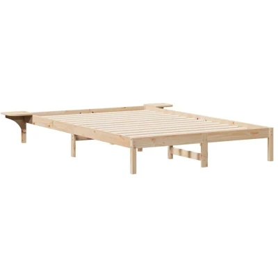 ManoManoGeneral description This bed frame is an exceptional addition to any modern bedroom, combining sleek design with ultimate functionality. Integrating side tables, it offers a sophisticated aesthetic while maximizing space by providing a convenient spot for bedside essentials. With a smooth finish and a solid pine wood structure, this platform bed frame is as elegant as it is practical, seamlessly fitting into contemporary home interiors. Technical specifications Colour: Natural Material: Solid pine wood Overall dimensions: 225.5 x 210 x 32 cm (L x W x H) Max weight: 200 kg Bed height: 32 cm Compatible Mattress Size: 160 x 220 cm Has slatted frame: Yes Max number of people: 2 Assembly required: Yes EAN: 8721288720337 SKU: 873250 Brand: vidaXL Installation Assembly is required by two people, utilizing just a screwdriver. Usage Simple maintenance is achieved with a wipe of a damp cloth, preserving the bed's elegant appearance with ease. Other information