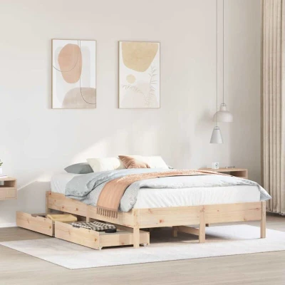 VidaXLGet a better restful night's sleep from this bed frame! It makes a welcoming addition to any bedroom. Stable and long-lasting frame: Solid pinewood is known for its strength and durability. Its straight grains and distinctive knots contribute to its rustic charm.Slatted base for optimal support: The bed frame is equipped with a slatted base for support and breathability for your mattress.Make full use of space: This bed frame features two drawers underneath, providing storage for items like extra bedding, seasonal clothing, and toys.Effortless manoeuvrability: This under-bed storage drawer features four wheels, providing smooth and effortless manoeuvrability for sliding in and out from beneath your bed. Good to know:A mattress is not included with this bed. We do offer a various selection of mattresses. You can check our shop for a matching mattress.