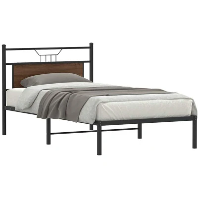 General description Get a better restful night's sleep with this stylish bed frame! It makes a welcoming addition to any bedroom, combining functionality with aesthetic appeal. Technical specifications Colour: Brown oak Material: Engineered wood and steel Overall dimensions: 207 x 105.5 x 91.5 cm (L x W x H) Clearance height under the bed: 27 cm Suitable mattress size: 100 x 200 cm (W x L) (mattress not included) With headboard Assembly required: Yes Usage Stable and long-lasting frame: The steel construction ensures strength and durability, making it suitable for various applications. Versatile headboard: Provides excellent back support for reading or watching TV while adding a decorative touch. Extra storage space: The bed base features additional space underneath for keeping storage boxes out of sight. Slatted base for optimal support: The metal bed frame includes a slatted base that enhances support and breathability for your mattress. Other information