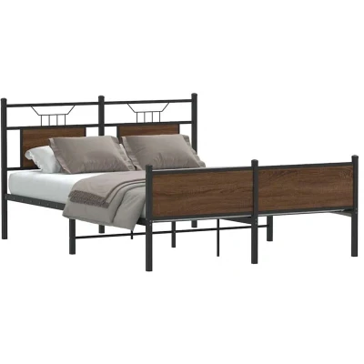 ManoManoGeneral description Get a better restful night's sleep with this stylish bed frame! It makes a welcoming addition to any bedroom, featuring a stable and long-lasting design. Technical specifications Colour: Brown oak Material: Engineered wood and steel Overall dimensions: 196 x 147 x 91.5 cm (L x W x H) Clearance height under the bed: 27 cm Suitable mattress size: 140 x 190 cm (W x L) (mattress not included) With headboard and footboard Assembly required: Yes Usage Functional headboard and footboard keep your mattress in place and provide excellent back support when sitting up in bed. Extra storage space underneath for keeping storage boxes out of sight. Slatted base for optimal support and breathability for your mattress. Other information