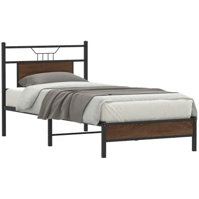 ManoManoGeneral description Get a better restful night's sleep with this stylish bed frame! It makes a welcoming addition to any bedroom, featuring a versatile headboard that provides excellent back support for reading or watching TV, while also serving as a decorative element. The bed base offers extra storage space underneath to keep your storage boxes out of sight. Technical specifications Colour: Brown oak Material: Engineered wood and steel Overall dimensions: 207 x 85.5 x 91.5 cm (L x W x H) Clearance height under the bed: 27 cm Suitable mattress size: 80 x 200 cm (W x L) (mattress not included) With headboard Assembly required: Yes Other information SKU: 4106989