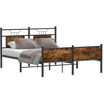 General description Get a better restful night's sleep with this stylish bed frame in smoked oak! It makes a welcoming addition to any bedroom, combining functionality with modern design. Technical specifications Colour: Smoked oak Material: Engineered wood and steel Overall dimensions: 207 x 147 x 91.5 cm (L x W x H) Clearance height under the bed: 27 cm Suitable mattress size: 140 x 200 cm (W x L) (mattress not included) With headboard and footboard Assembly required: Yes Usage Stable and long-lasting frame: The steel construction ensures strength and durability. Functional headboard and footboard: Keeps your mattress in place and provides excellent back support for sitting up in bed. Extra storage space: The bed base features space underneath for storing boxes out of sight. Slatted base for optimal support: The metal bed frame is equipped with a slatted base for support and breathability for your mattress. Other information