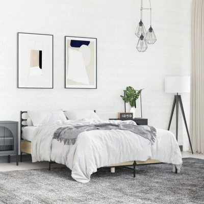 General description Get a better restful night's sleep from this bed frame! It makes a welcoming addition to any bedroom. The bed frame is designed to provide excellent support and comfort, featuring a stylish Sonoma oak finish. Technical specifications Colour: Sonoma oak Bed frame material: Engineered wood, metal Slat material: Plywood Overall dimensions: 193 x 138 x 74 cm (L x W x H) Suitable mattress size: 135 x 190 cm Double (W x L) (mattress is not included) Assembly required: Yes Usage Durable material: The engineered wood is of exceptional quality with a smooth surface, providing strength, stability, and resistance to moisture. Metal legs and plywood slats: The bed frame includes metal legs and plywood slats to support your mattress and enhance breathability. Excellent support: The headboard offers excellent back support when sitting up in bed to read or watch TV. Other information