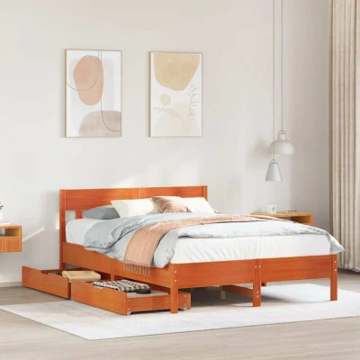 ManoManoGet a better restful night's sleep from this bed frame! It makes a welcoming addition to any bedroom. Stable and long-lasting frame: Solid pinewood is known for its strength and durability. Its straight grains and distinctive knots contribute to its rustic charm. Slatted base for optimal support: The bed frame is equipped with a slatted base for support and breathability for your mattress. Versatile headboard: This bed frame comes with a headboard that provides excellent back support when you sit up in bed to read or watch TV, while also serving as a decorative element. Make full use of space: This bed frame features two drawers underneath, providing storage for items like extra bedding, seasonal clothing, and toys. Effortless manoeuvrability: This under-bed storage drawer features four wheels, providing smooth and effortless manoeuvrability for sliding in and out from beneath your bed. Good to know: A mattress is not included with this bed. We do offer a various selection of