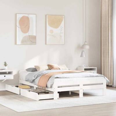 ManoManoGeneral description Get a better restful night's sleep from this bed frame! It makes a welcoming addition to any bedroom. The stable and long-lasting frame is made from solid pinewood, known for its strength and durability. Its straight grains and distinctive knots contribute to its rustic charm. The bed frame is equipped with a slatted base for optimal support and breathability for your mattress. Additionally, it features two drawers underneath for storage, making it perfect for items like extra bedding, seasonal clothing, and toys. The versatile headboard provides excellent back support when sitting up in bed to read or watch TV, while also serving as a decorative element. The under-bed storage drawers come with four wheels for smooth and effortless maneuverability. Technical specifications Colour: White Material: Solid pinewood Assembly required: Yes Bed dimensions: 203.5 x 164 x 53 cm (L x W x H) Clearance height under the bed: 19 cm Suitable mattress size: 160 x 200 cm (W x L)
