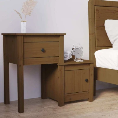 General description This trendy wooden bedside cabinet, featuring a sleek and classic design, is meant to upgrade your interior to the next level. Made from solid pine wood, it showcases a beautiful natural material with a straight grain and rustic knots. Technical specifications Material: Solid pine wood Colour: Honey brown Dimensions: 79.5 x 38 x 65.5 cm (W x D x H) Installation Flexible installation: The low and high parts can be installed on the left or right flexibly. Assembly manual included for easy setup. Usage Ample storage space: The nightstand has 1 drawer and 1 compartment with a door, providing ample space to keep your magazines, books, remote controls, and other small items well organized and within reach. Sturdy top: The two sturdy tops are ideal for displaying decorative objects, photo frames, and potted plants. Other information WARNING: In order to prevent overturning, this product must be used with the wall attachment device provided. SKU: 814545