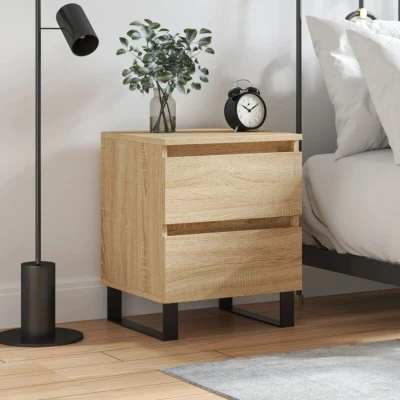 ManoManoGeneral description This bedside cabinet with an elegant design makes a timeless addition to your interior decor. Technical specifications Colour: Sonoma oak Material: Engineered wood, iron Dimensions: 40 x 35 x 50 cm (W x D x H) Assembly required: Yes Usage Ample storage space: Equipped with 2 drawers, the bedside table offers handy storage space for keeping your magazines, books, remote controls, and other small items well organized and within reach. Stable top: The stable top of the nightstand can be used to place decorative items like photo frames and potted plants. Other information Warning: To prevent it from being overturned, this product must be used with the provided wall attachment device.