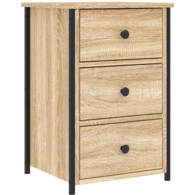 VidaXLThis bedside cabinet with an industrial style makes a timeless addition to your interior decor. Durable material: The engineered wood is of exceptional quality with smooth surface and also features strength, stability and resistance to moisture.Sturdy frame: The iron frame of the bedside table ensures sturdiness and stability.Ample storage space: Designed with 3 drawers, the side table offers ample storage space for keeping your various daily essentials well-organised and within easy reach.Adjustable feet: The side cabinet is equipped with 4 adjustable feet that can protect your floor from scratches and keep it stable on the uneven floor.Displaying function: You can place your favourite photos, decorations, or flowers on top of the nightstand to enrich your life. Warning:To prevent it being overturned, this product must be used with the provided wall attachment device.