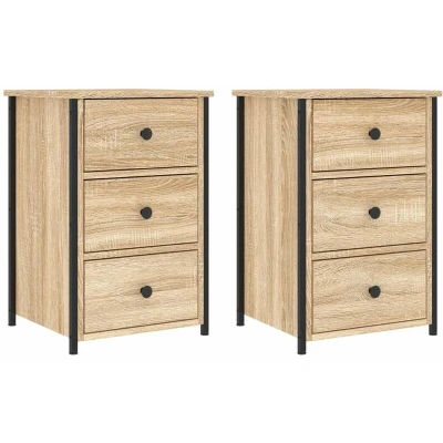 ManoManoGeneral description These bedside cabinets with an industrial style make a timeless addition to your interior decor. They are designed to provide ample storage space while enhancing the aesthetic of your room. Technical specifications Colour: Sonoma oak Material: Engineered wood, iron Dimensions: 40 x 36 x 60 cm (L x W x H) Assembly required: Yes Delivery contains: 2 x Bedside cabinet Installation To prevent it from being overturned, this product must be used with the provided wall attachment device. Usage Designed with 3 drawers for keeping various daily essentials well-organised and within easy reach. Top surface can be used to display photos, decorations, or flowers. Equipped with 4 adjustable feet to protect your floor from scratches and maintain stability on uneven surfaces. Other information